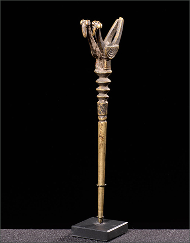 Brass and bronze castings from Burkina Faso are among the best in Africa. This hairpin consists of a pair of birds beautifully conceived perched on an elongated extension that would be placed into the coiffure. The bird’s bodies have a beautiful curve from the tip of the tail to the end of the beak. The patina is aged and warm from handling. A similar but less ornate example can be found in Thomas Wheelock's book, Land of the flying masks fig. #338.