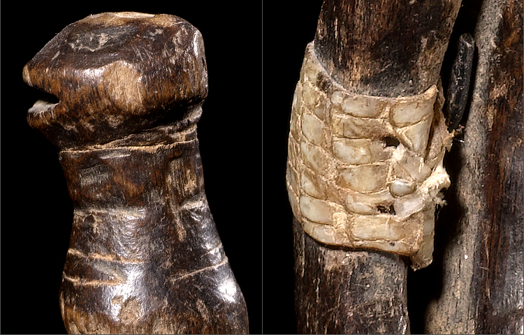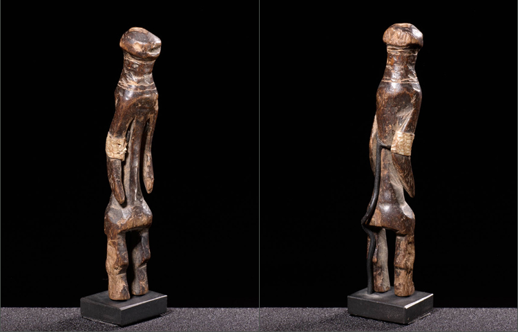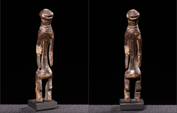 Mumuye miniature charms of this extreme small size are incredibly rare. Despite its scale this example has the power of a full-size figure. With its slightly tipping torso and its animated arms and body this figure exemplifies what is most compelling about Mumuye art. The patina is deep and rich from handling and there are still traces of leather attached to the figure. In excellent condition.