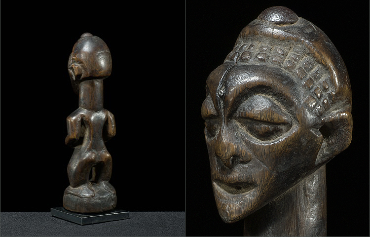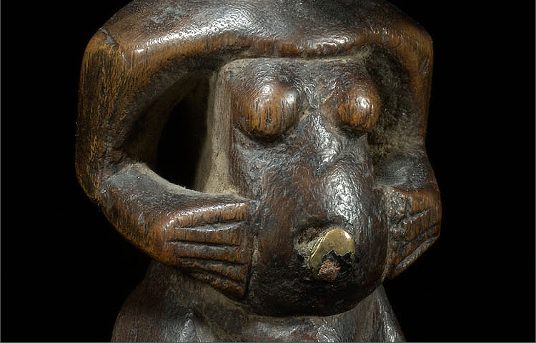The Songye produced a large number of fetish figures. These figures were used in rituals to connect with the spirit world. Because of their powerful nature, the sculptural style exhibits an intense dynamism and vitality. This particular figure is male and stands on a circular base, with his hands placed on his pointed belly. The facial features and hairstyle are very geometric. Rounded nails have been hammered into the sculpture; On the belly and forehead. These nails counteract evil spirits and can channel power. A small cavity is visible all the way through the head, with openings in either ear. This would have been filled with fetish material called boanga.