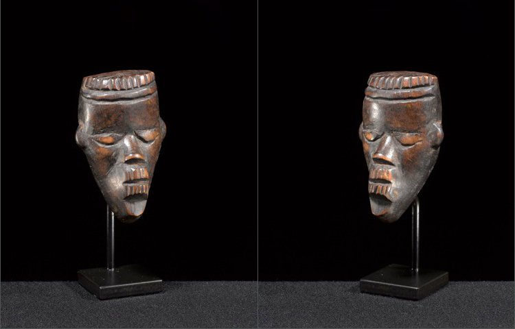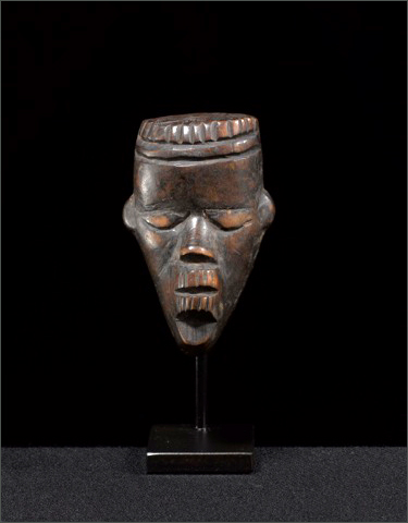 The Dan believe that masks are materializations of supernatural spirits, which make themselves known to humans who they wish to assimilate with. Small masks are called Passport Mask and can provide protection to a family or act as a form of personal identification. These masks are extremely individualistic. This example from the early 20th Century is distinctly Dan, with its domed forehead and facial features carved in raised relief. The mask's wood exhibits an almost marbled patina, suggesting prolonged handling.