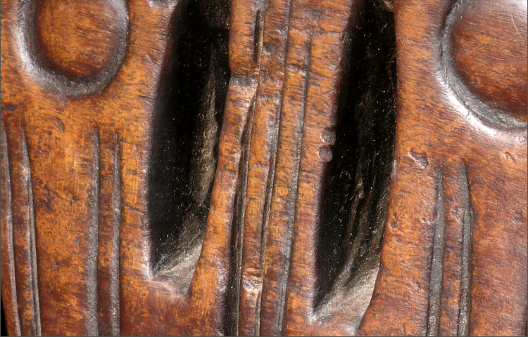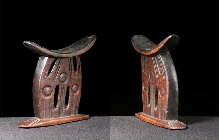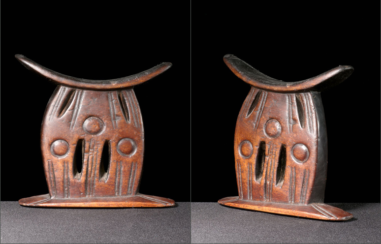 This is an old and fine example of a Ethiopian headrest. The design on the base is unique and visually appealing; three circles are in a rare pyramid formation; in addition to slits of negative space. The surface is simply wonderful; the deep oily patina suggests a long history of use. Many of these headrests are made from a softer wood and are plentiful at mediocre quality; this is one of the oldest examples I have owned and probably the most beautiful.