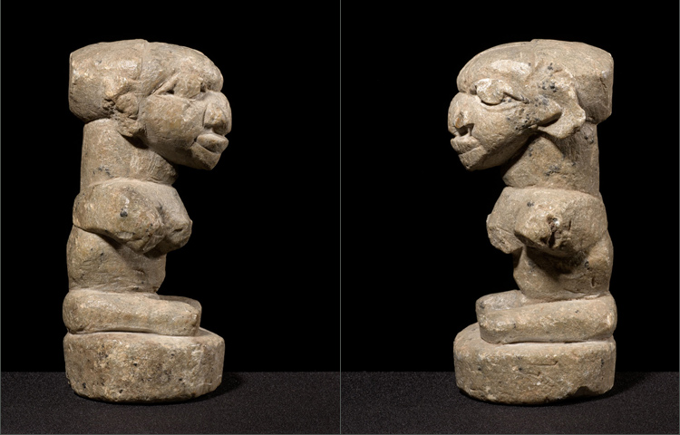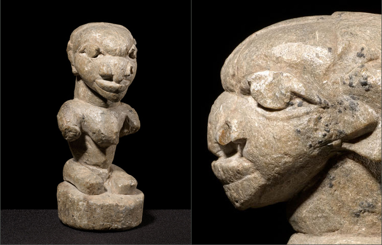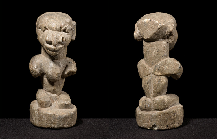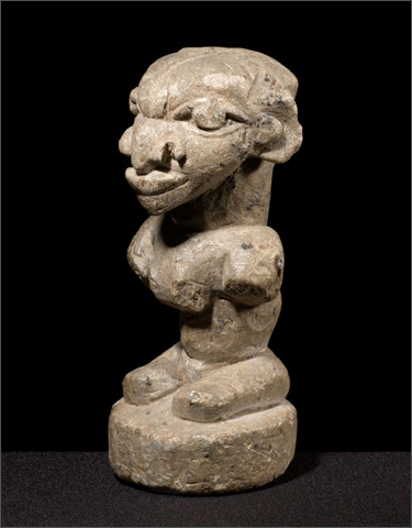 This is an extremely elegant and classic example of a Sherbro stone effigy. The face is rendered in traditional Afro-Portuguese style and the body is finely conceived as well. It is unusual to see such detail in the back portion on these figures. This figure's spine is delineated as well as the shoulder blades. The arms are in fact broken off but from generations of handling the breaks have developed a smooth surface. These stone figures come in numerous colors, shades and patinas; this example has a warm yet soft look to the stone that is quite appealing.