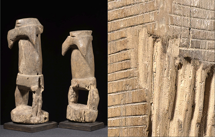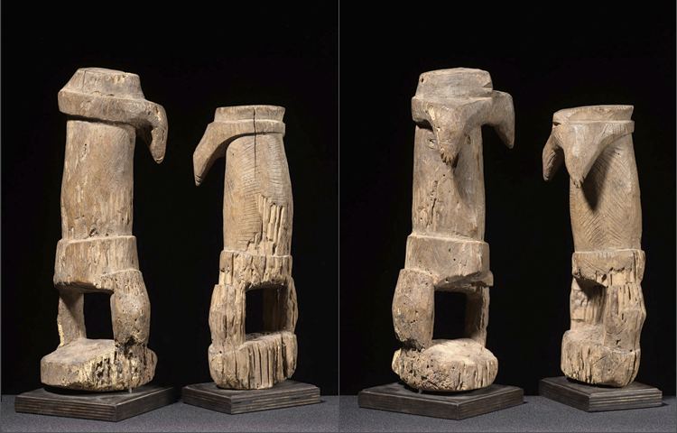 These enigmatic figures from Northern Togo-land are rare examples. While many examples on the market today are sculpturally stiff, this pair has emotion and movement. The heads on both the male and female are stylized, and the scarifications on the bodies are representative of ritual scarring. There is some erosion on both figures from exposure to the elements.