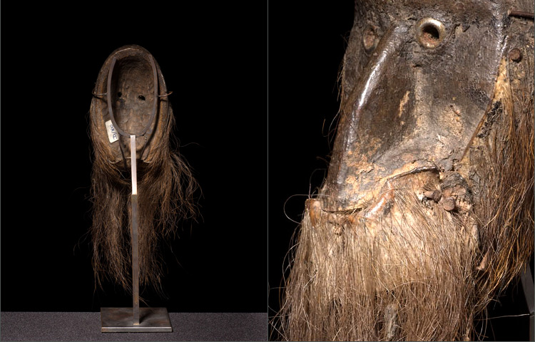 Produced for personal use, passport masks replicate masks worn in dance performances in West African societies. Carried on the person, these masks act as powerful charms and protective agents. This Gogon mask exhibits avian characteristics, such as small closely set eyes and a beaked nose. The fiber beard is a rare feature, while the mask’s patina is heavily worn, giving it a rich texturized surface. A similar example can be found in Eberhard Fischer and Hans Himmelheber’s book, Die Kunst der Dan, fig. 139.
