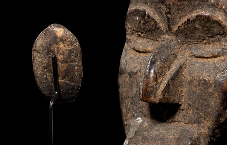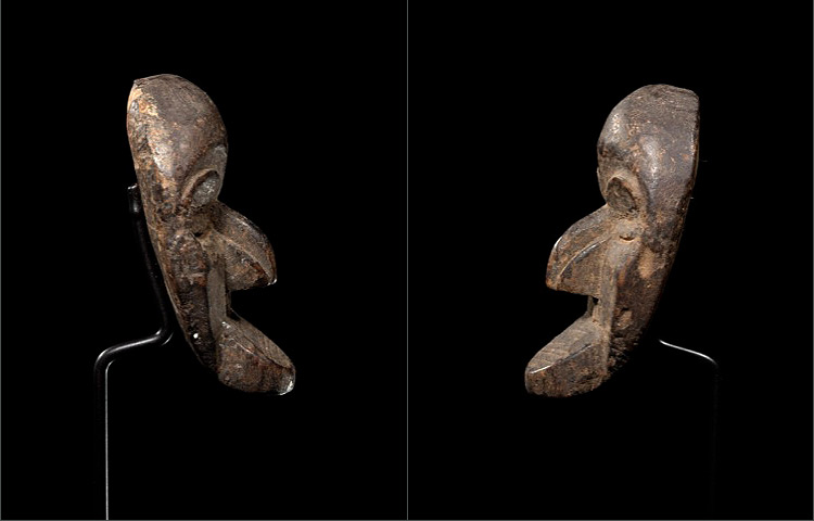These miniature masks fulfilled a variety of functions within Dan society. Anyone who claimed a spiritual connection with a mask was entitled to commission a miniature. Constantly rubbed with oil and other substances, these mask were kept with the owner, were amongst their most prized possessions and can share the power and protective agencies of the full size versions. This mask’s sunken eye slits, bulging forehead, and large beaked nose is reminiscent of the Ge Gon mask. Well worn, this mask exhibits a marble patina.