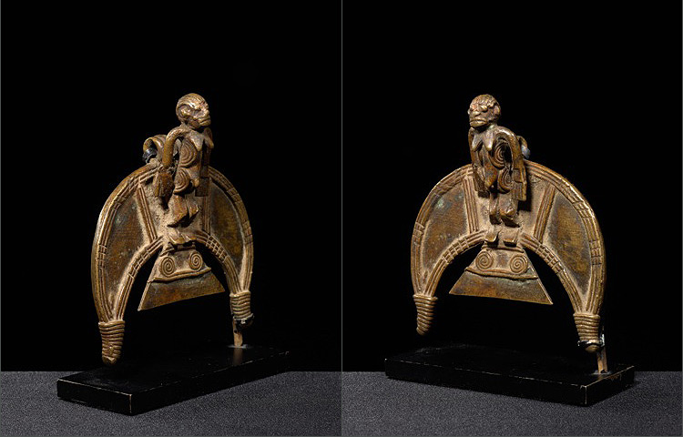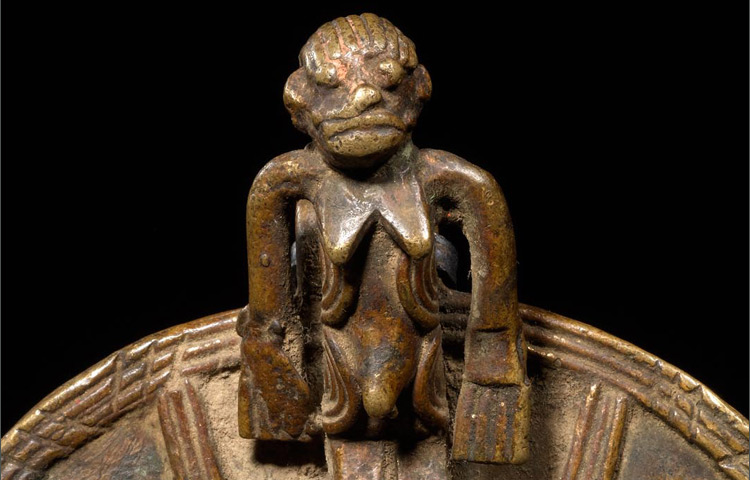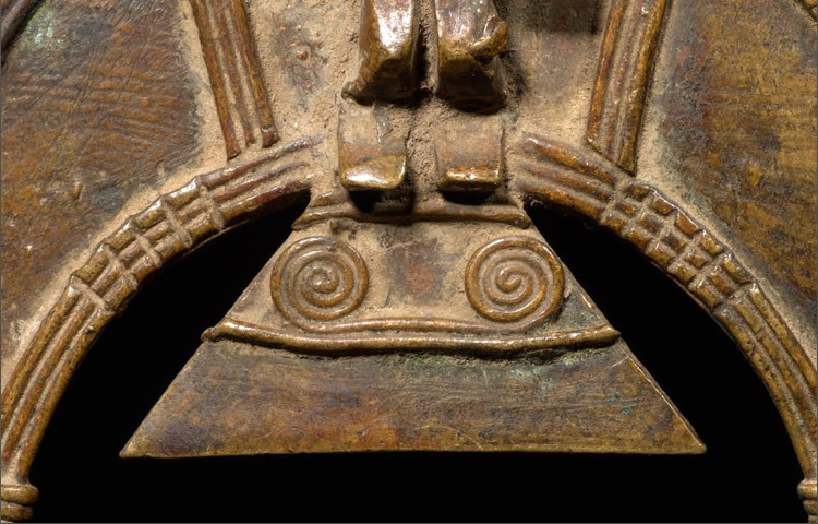 Full figurative pendants are rare amongst the Bobo. Used as personal artifacts and intimate in nature, these objects were prescribed by diviners as protection and to protect women during pregnancy. Made of a cast copper-alloy, these pendants were customized to enhance their significance to their owner, usually an adult woman. This crescent shaped pendant is ornately designed with the figure of a women at its center. The figure is beautify rendered. The long arms, dynamic face, and coiffure are heightened by the spiral designs on the figure’s sides.