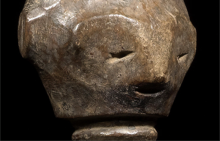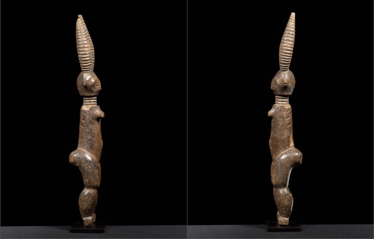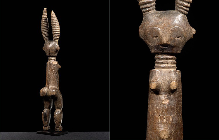 The female figure from the Fante is another example of an Akuaba, or a fertility doll carried by women who wish to conceive a child. Different from those of the Asante, this Fante example still retains the cylindrical torso, but lacks the abstract arms, instead, exhibiting sturdy legs. The head is small and stylized, using small notches and changes in the wood’s plane to delineate features. To large ringed cone shapes on top of the head represent the figure’s elaborate coiffure. The rings around the neck and three subtle notched lines above the navel are features associated with Fante ideals of beauty.