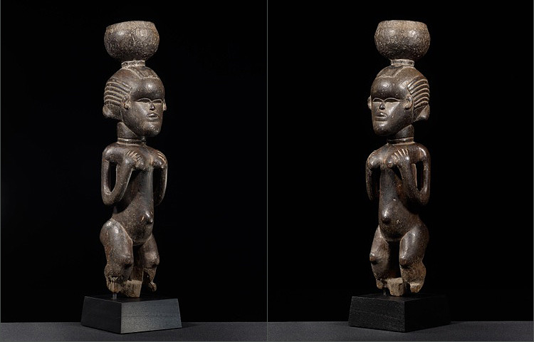 Ancestor figures were privately owned and associated with divination. Possibly used in the context of women Bundu associations (similar to men’s poro societies). Nevertheless, these figures are rare. Beautifully carved, the simplified face, short nose, slit eyes, and rigid brow are similar to the facial features that appear on Toma masks. The gesturally carved body suggests subtle movement with the figure’s delicate hands resting on top of her breasts. Subtle lines and geometric patterning delineate her coiffure culminating in a bowl like object attached to the top of her head.