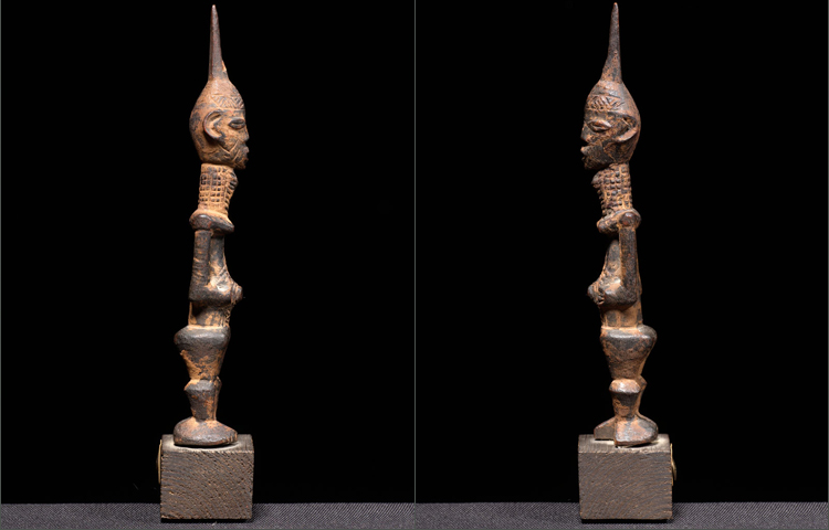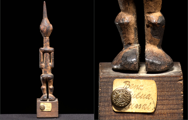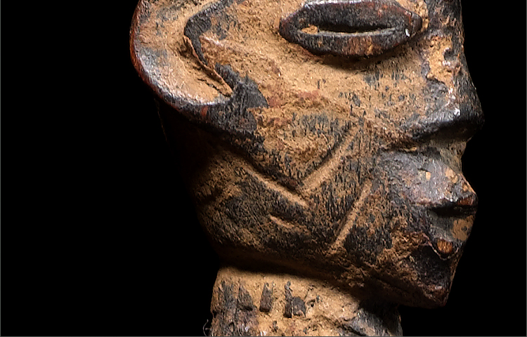 Amongst the rarest of miniature Congolese figures are small protective figures called 'Lupinga lwa bwimpe' carved by the Bena Lulua to protect newborns and small children. This particular example is quite fine with its tightly carved and heavily tattooed body; which is a sign of the figures great age; the traditional tribal tattoos of the Lulua disappeared more than a century ago. The face is expressive and classically sculpted with a horn projecting out of the top of the head. The exceptional patina is deep and encrusted with the regular tribal mixture of cam-wood; oil and rain water. The original wood base has a very old label 'Bena Lulua Kasai'.