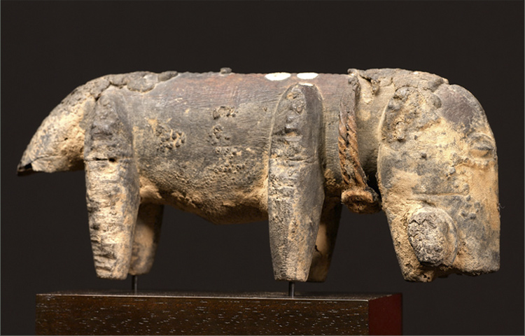 This rare shrine figure in the form of a dog holding a baby dog in its