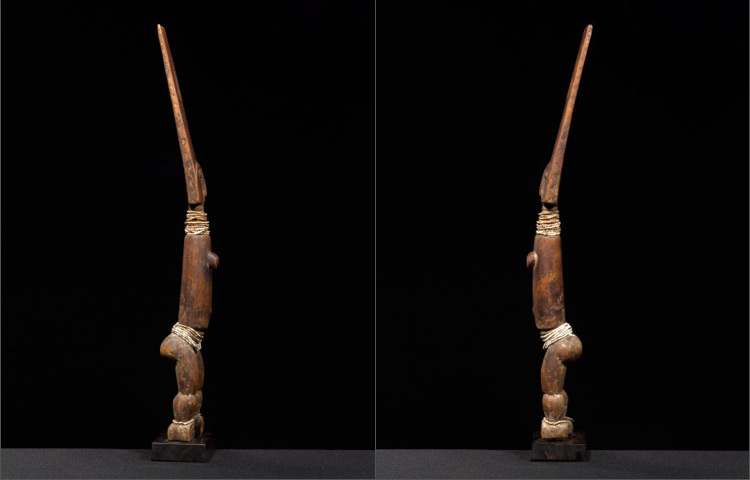 Fante fertility doll’s served similar purposes as others produced throughout Ghana. This example’s exaggerated head with a flat/rectangular shape corresponds to the conception of ideal beauty. The simple arched facial features are commonly found in other forms of Fante art. The long sturdy body is devoid of arms and has original beaded ornamentation wrapped around the neck and waist. The flat nature of the dolls made it easier for the woman to carry the doll at the back of her skirt. There is an elegant geometrical carving on the back this figure.