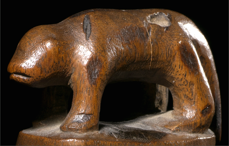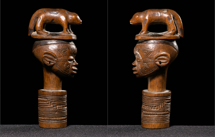 With its arch-typical Makonde face this stopper was carved by a master. The scarification on the face have deeper meaning than just decoration they are clan related. But what makes this example special is the animal perched on top of the head. This is rare and most of all exhibits the inventiveness of the carver. The deep geometric patterns on the base are also very well done. An early collected example; in excellent condition.