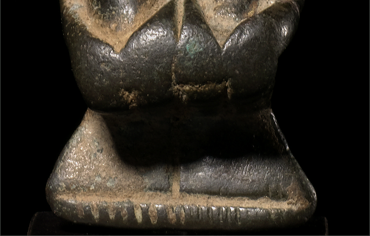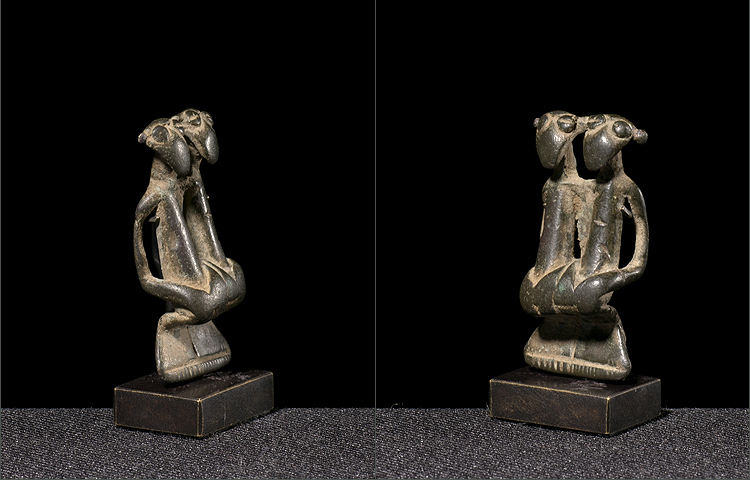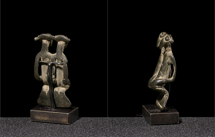 Authentic double Kulango bronze charms are becoming harder and harder to find. This example from the well known miniature collection of Michael Oliver in NYC is the archetype. The elongated almost birdlike faces have a stylized human body that has great openwork and movement. The surface is heavily worn from handling over the generations; and the bronze has that classic patina that can only be acquired through years of exposure and use creating soft curves to the highpoints. The casting is superb and in excellent condition.
