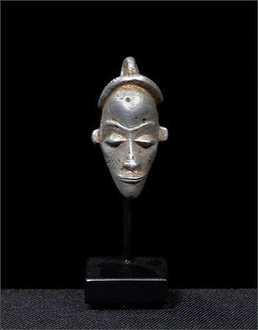 The Pende replicate masks in miniature form. Made to be worn as decorative pendants, they can be made out of various materials. They function as protective and healing amulets. The Pende are also known for their beautiful renderings of the human face. This miniature mask is no exception. The almond shaped face, with diamond eyes, arched brow, subtle nose and mouth are molded perfectly. Facial scarring is visible on the cheekbones. The naturalistic appearance is striking for such a small object.