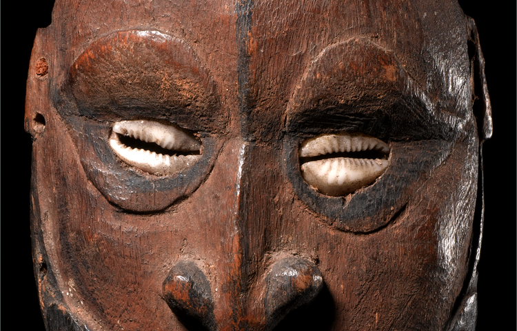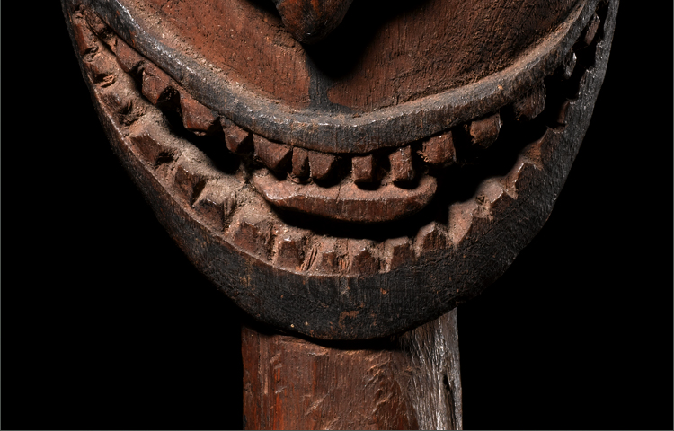 Carved with non-metal tools; this flute stopper is a pure early representation of Iatmul sculpture. The face exudes presence; with its original pigments; shell eyes that gaze out into the spirit world and the emotive toothy grin. This head was used as a stopper for the large sacred flutes used by the Iatmul people. Pierced for attachment, this is an old arch-typical example.