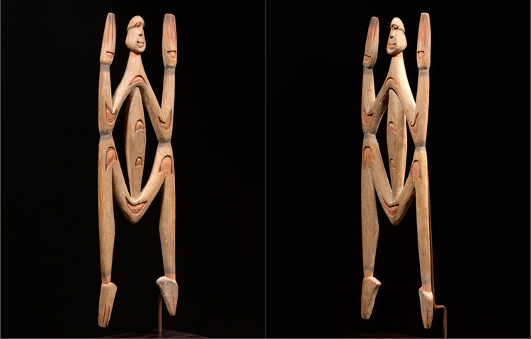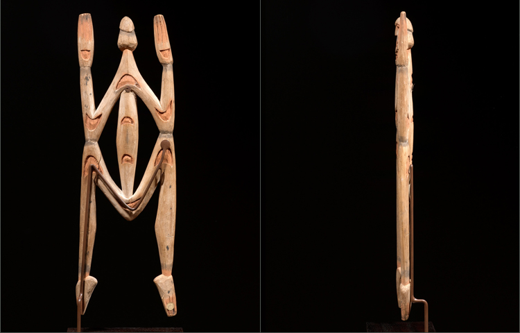 Asmat sculpture is known for its elaborate stylized representations of the human form. This example conceived in a delicate flat plane captures the viewer with its pure modern conception and highly emotive face. The surface of the wood has a deep antique quality due to its age; and there are traces of its original pigments. There are old inventory numbers on the back leg (#423)