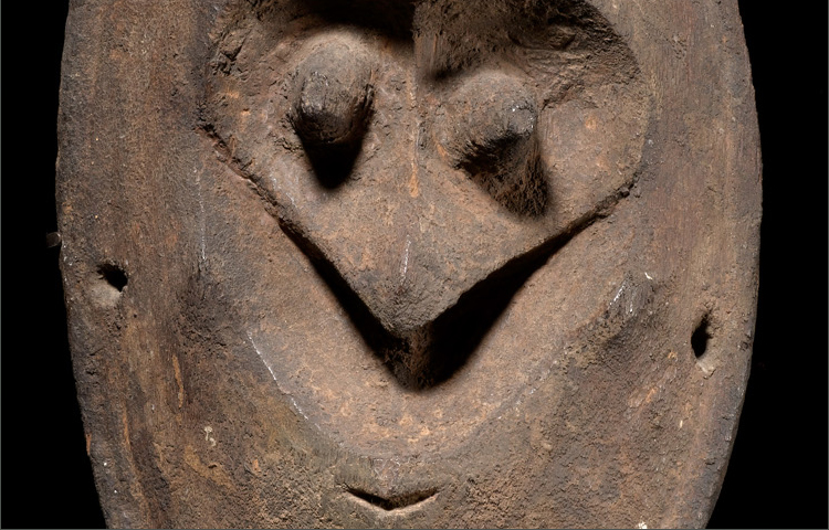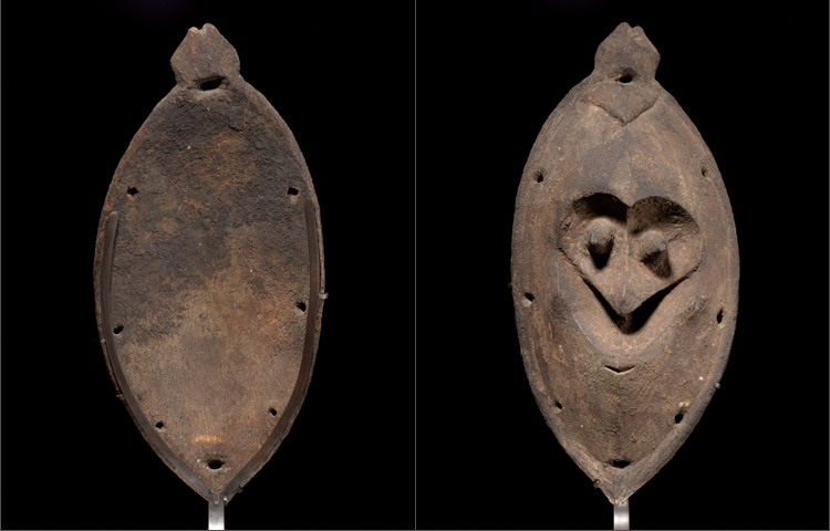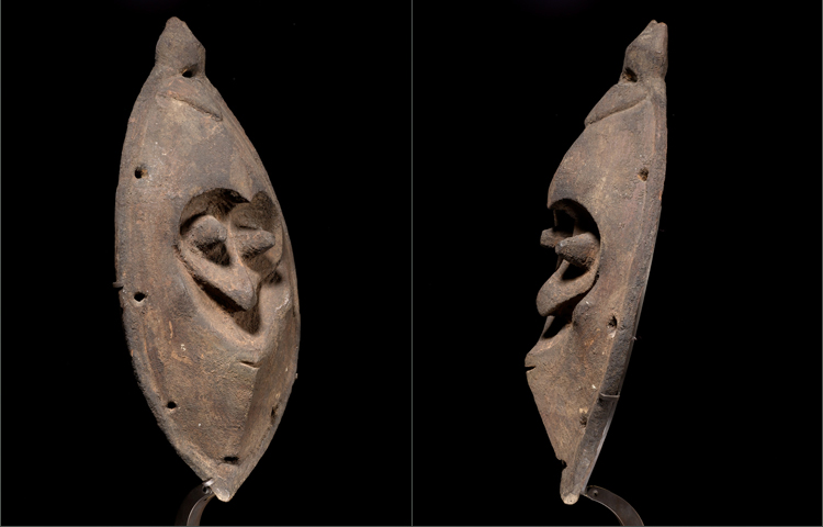 This is a very rare stone carved example of a Madang Provence dance mask. Wonderfully conceived with a deeply cut section exposing its eyes, nose and diminutive mouth. The patina is exceptionally deep and encrusted from age. The mask is pierced around the rim. C.F New Guinea Art Master Pieces from the Jolika Collection (Marcia and John Friede) Fig 131 for a related example.