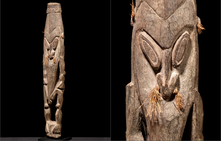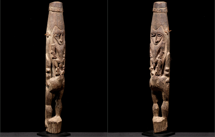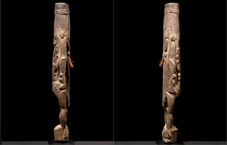This is a superb example of Keram River sculpture. Representing the ancestor clan; the main figure is conceived in powerful form with archetypical angular face and a body with great poise. What is most interesting about this figure is its totem like form; with a smaller carved ancestor sculpted with great tension and power on the reverse side; it is as if it is going to leap from the sculpture to protect its brothers not yet in the spirit world. The septum’s are pierced as well as the ears; which all still retain the original fiber ornaments. Carved from hardwood with non-metal tools.