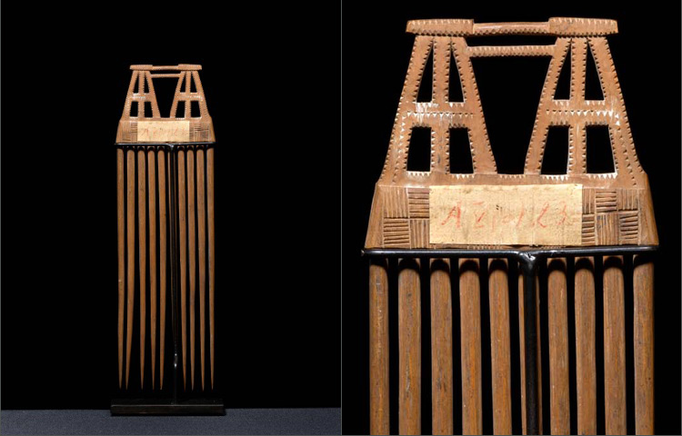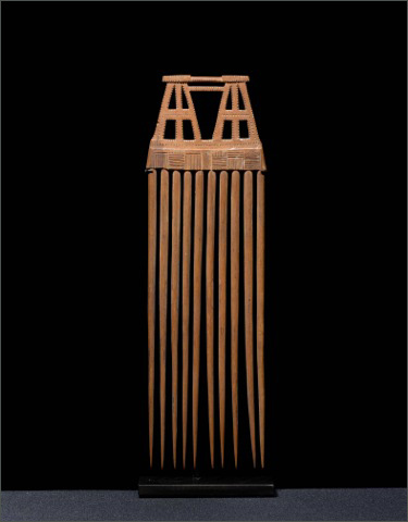 The intricately carved surfaces of wood sculpture from Kaniet and Hermit Islands north of New Guinea, such as this comb starkly contrast with the minimalist aesthetics characteristic of the works from elsewhere in Micronesia. The present man’s comb was worn in the hair as a decorative accessory. For Kaniet men, hair was considered a sacred part of the body.