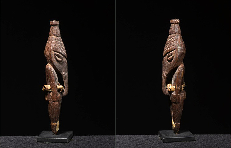 This finely carved Amulet Figure was collected in the early 20th century. Finely carved with a beautiful aged patina, the Amulet still retains an original fiber attachment around its waist; a common feature on amulets from the Ramu River region. The face is classically carved and elongated with a hooked nose, giving the figure an imposing glare and highlighting the eyes. The top of the figure's head has been decorated with an asymmetrical design.