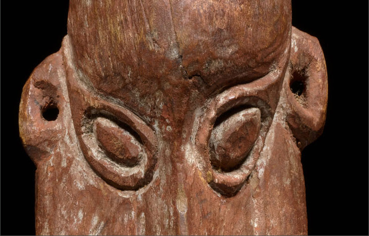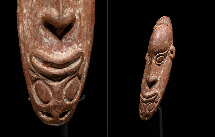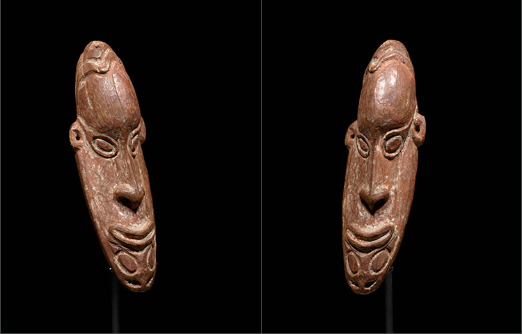 Originally attached to a fiber bilum bag, amulet masks were utilized as protective charms. Made of wood and stone carved, this example is beautifully sculpted. The oval shaped face, slight off-symmetry of the features, large circular eyes, and hooked nose are common aesthetic features in Sawos art. Carver’s marks are visible and give the objects a captivating texture.