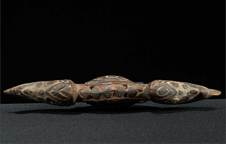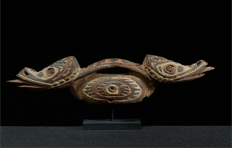 Dance ceremonies in the Lower Sepik River region were accompanied by elaborate costumes. This Dance Ornament would have been hung from a costume of one of the performers. The double headed ornament depicts two stylized birds with extended tongues. Birds were a common motif in Lower Sepik River region cosmology and their sounds were often mimicked in such dance performances. The body of the ornament is covered in raised relief decoration. In great condition, the ornaments original paint colors are still visible. These objects are extremely rare in this condition. for a very similar example see "Kunst Vom Sepik" Volume 1, figure, 129.