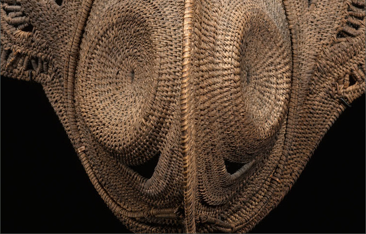 Yam masks were produced in abundance by the Maprik for their yearly agricultural festivals, in which yams were a central focus. These masks are made of organic materials, and therefore very few remain today in such complete condition. This example is particularly extraordinary. The headdress attached to the mask is still intact, displaying the elaborate weaving techniques of the Maprik. The mask is intentionally twisted, giving the object beautiful movement and depth.
