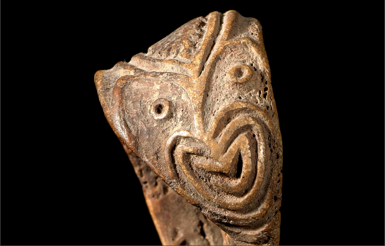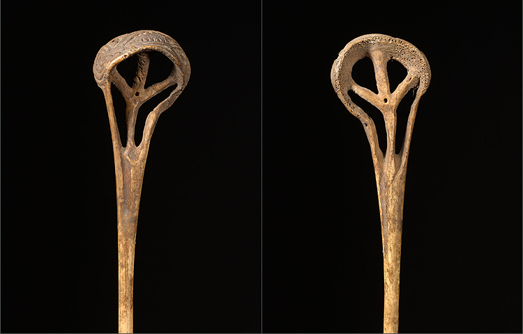 This unique Lime Spatula, made out of the bone of a cassowary bird, is powerful in its simplicity. The long, thin spatula has developed a shiny patina due to heavy handling, while the porous nature of the bone adds wonderful texture to the decorative handle. The handle is decorated with a double faced engraved motif, intertwined by curvilinear patterning.