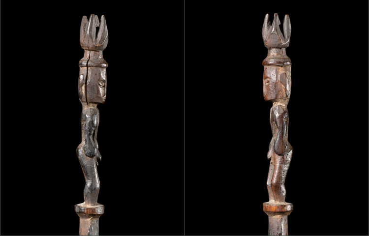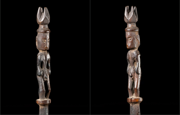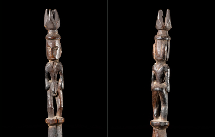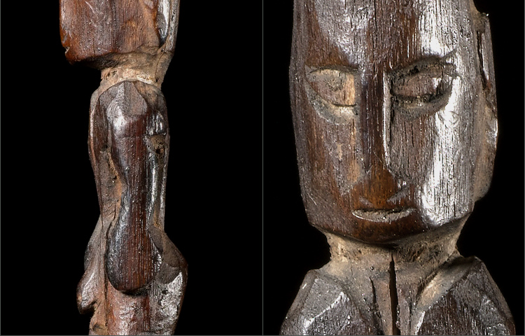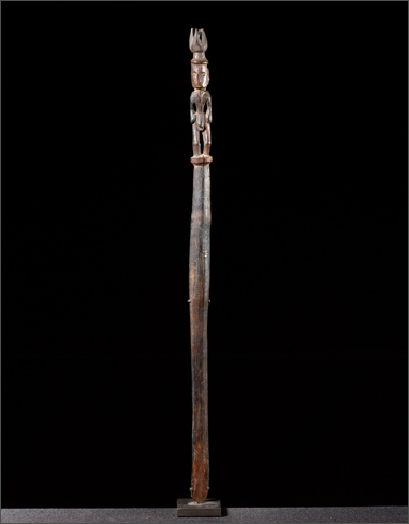 Spatulas for the application of Lime can be found all over Oceania. This example is from the Admiralty Islands; figurative sculpture from this area is difficult to acquire. This example consists of a finely carved ancestor with elaborate crown. There is great attention to detail; such as a delineated scapula, and arms that are carved away from the body. The patina is rich and deep from generations of use and handling. In excellent condition.