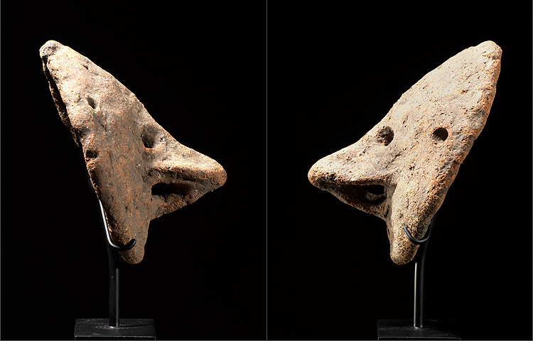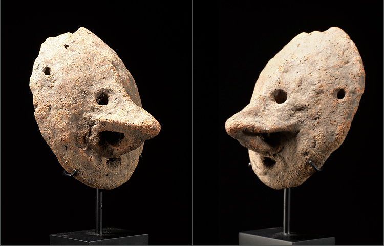 This is another example of a miniature Terra cotta mask from the Pora Pora river. Reducing the imagery to pure traditional Sepik characteristics; the result is a wonderful conception that is primal and archaic. The elongated nose and angular plane of the face is quite reminiscent of the well known Sepik mosquito masks. This mask is pierced for attachment and it has a varied patina from age and exposure.