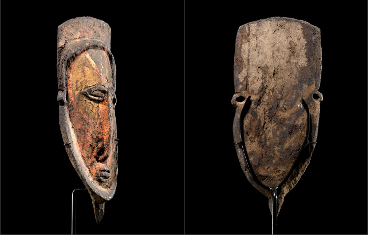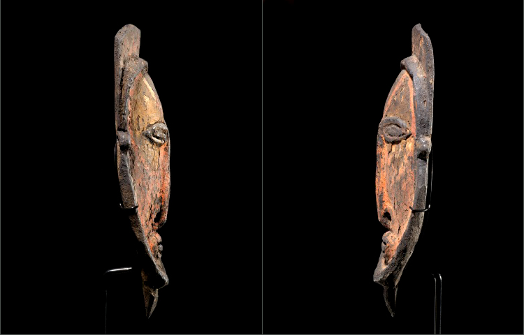 Woven and wooden masks are used to decorate large yams during the harvest. This diminutive mask is an ornament used during this ceremony. The classically conceived face is sculpted within a deep facial frame. The features are tightly rendered with beautiful original pigments throughout. This early example was carved with non-metal tools and has a fine encrusted patina from age. In excellent condition.