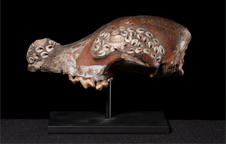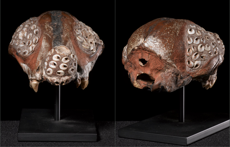 This fascinating and early amulet is created from the cranium of a dog. The skull has been decorated with organic pigments and skillfully molded with Conus, Nassa and Cowry shells. There still remains some of the original teeth. Not only is this object aesthetically pleasing; but to the tribal member an important clan object; for the powers of the dog were transferred on to him when carried. In excellent overall condition for its age and fragility.