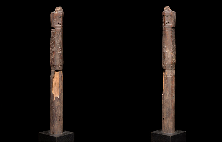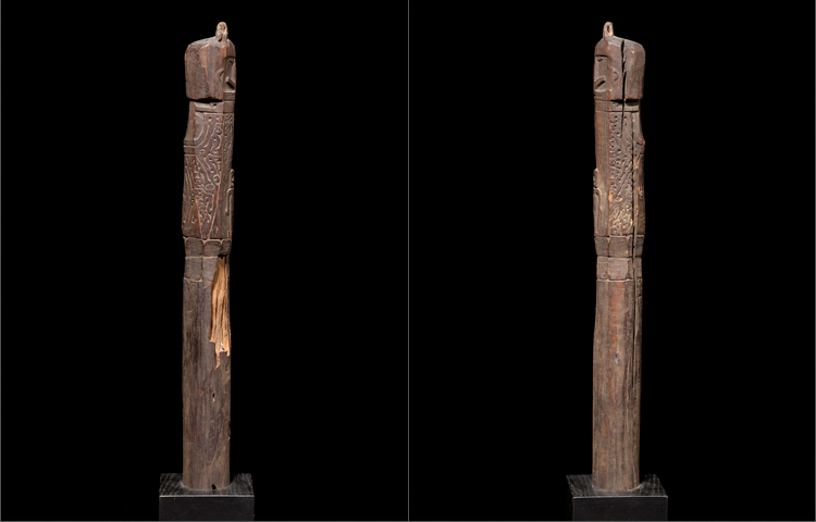 The terminal of this pounder displays a wonderfully carved abstract figure that watches over a charming and diminutive child carved in relief in pure Korwar style. There are also several totally abstracted figures carved into the decorations creating a surreal work of art. This is a very old and rare example of superb quality.