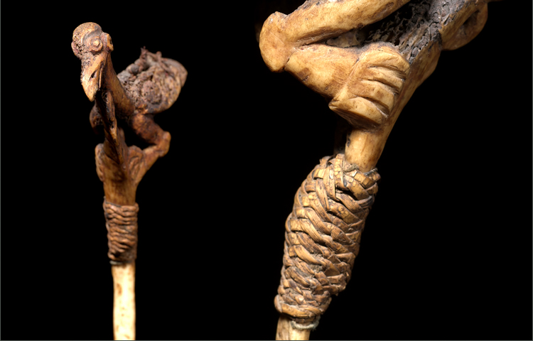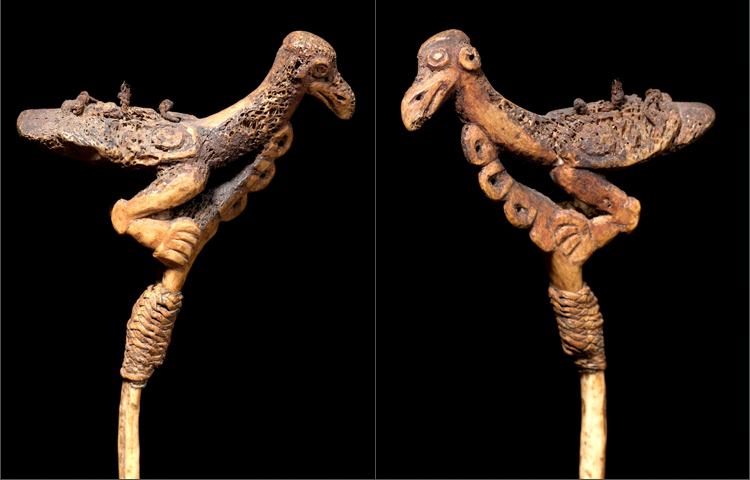 This very old and rare lime stick is carved from the femor bone of a Cassowary bird. The imagery is of a bird sitting on the top of a branch. The bird is conceived with extraordinary personality. Details like the subtle tilt of the head and the way that the feet are perched onto the stylized ‘branch’ make this sculpture actually feel alive. The porous bone gives the surface an aged patina and texture that exhibit’s the generations of use this spatula has seen. There is a small area of rattan tightly wrapped onto the bone; this area would have been sticking out of the lime container. In overall excellent condition considering its delicate medium.