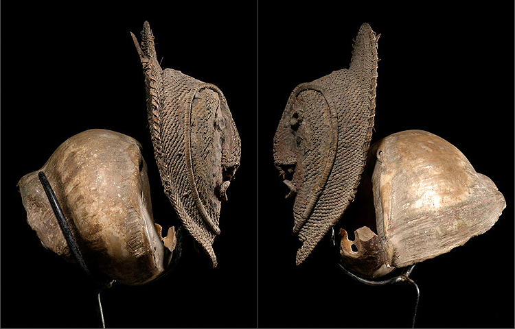 This is a fantastic example of the type of currency that is used in the East Sepik Provence mainly for inter village transactions and bride price payments. This complete example with its finely woven rattan mask with heart shaped contour makes this object special.. The large snail shell is original to the piece; but it has been professionally reattached back to the mask. The pigments are old and original.