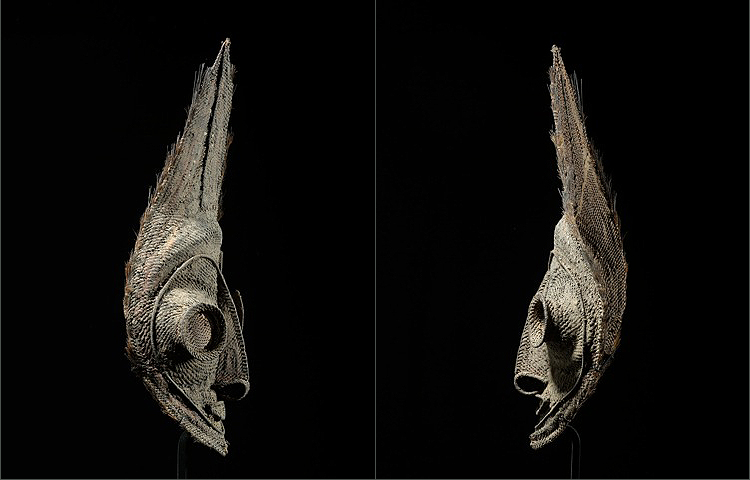 This very finely woven Talipun is a superb example. These masks were originally attached to shells and were used mainly for intervillage transactions and bride price payments. Most other talipun masks can be quite static, this example has an organic movement to it. It is very skillfully woven; some of its distinctive features include; a heart shaped outlined face, with prominent protruding eyes, and a very finely shaped nose and mouth. Remains of cassowary feathers and original pigment are still evident as well. The surface patina is quite old.