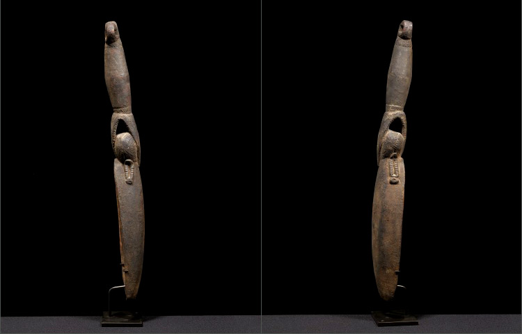 This Huon Gulf ladle would have only been used during special ceremonies. This example is incredibly dynamic due to its symbology. The handle, fashioned into the abstract body of a crocodile, extends towards the bowl of the ladle. The stylized crocodile head, with mouth open, bites down upon the head of an anthropomorphic ancestor figure. The ancestor head is also abstractly carved with no facial features and recognized by the presence of elaborate earrings which dangle down both sides of the ladle’s bowl. The belly of the bowl is heavily worn away with an encrusted patina from repeated storage and use.