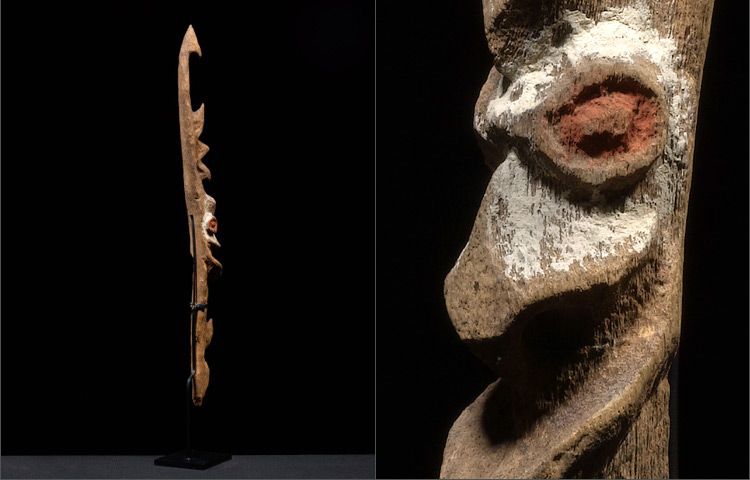 Also known as “hooks”, these figures are considered to be living beings that aid in hunting and warfare. Stored in caves, these objects were painted with lime and red ochre pigments, some of which are still visible on the surface. The carver took great care in creating this particular object. Using the natural shape of the wood, the artist instilled a wonderful sense of movement. The hook motif is present throughout the entire object. A spirit face is visible towards the lower half. The large eyes and hook nose of the face are iconic of the Sepik River Region.